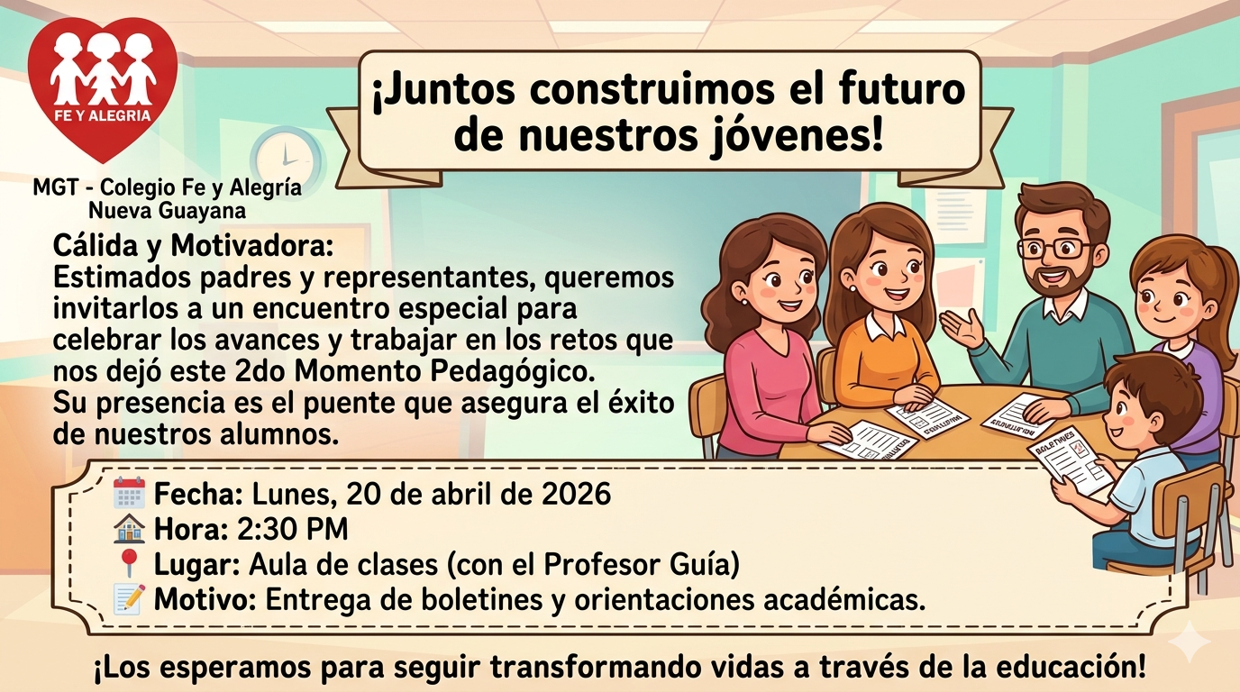 Saludos familia del Fe y Alegria, estas cordialmente invitadas a este compromiso general, donde conoceras el avance de tu representada. Ánimo, Asista